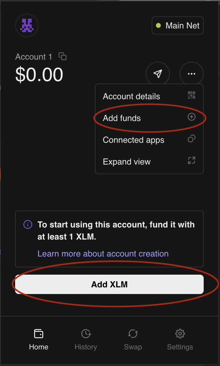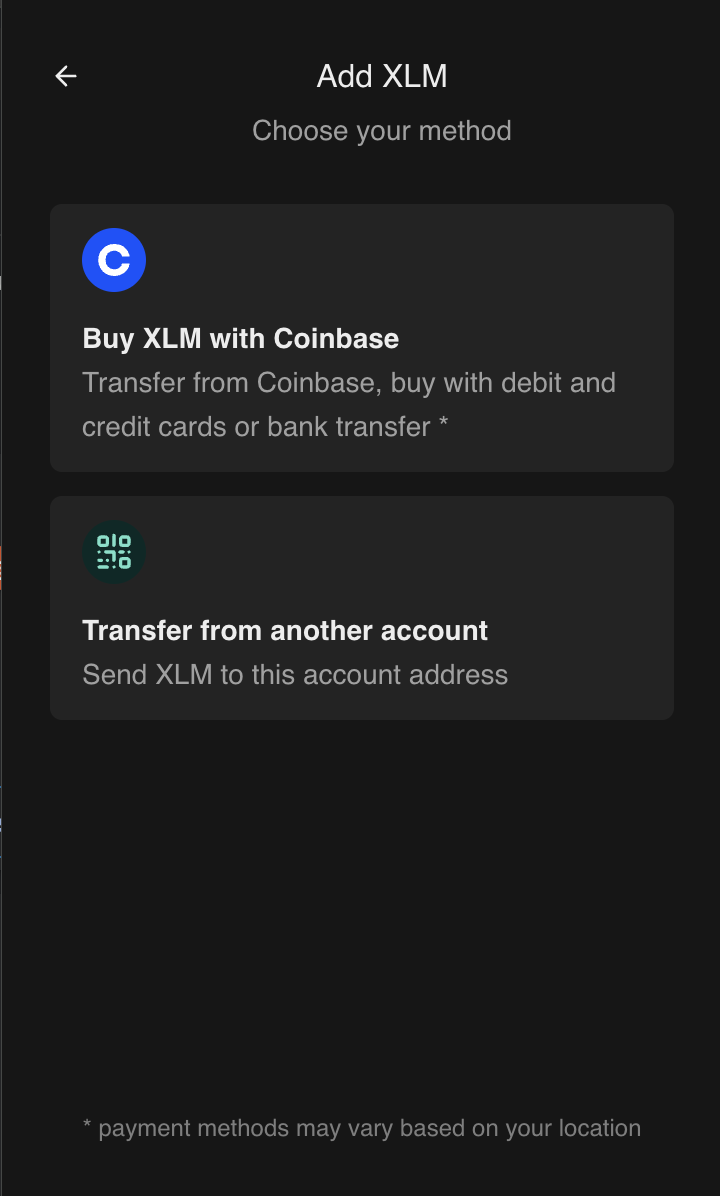 If your account is unfunded, you can simply click the Add XLM button on the Account screen. This will take you to a screen where you can Buy XLM With Coinbase. This button will take you to Coinbase where XLM will be preselected for you and your Freighter address will be prefilled as the destination.