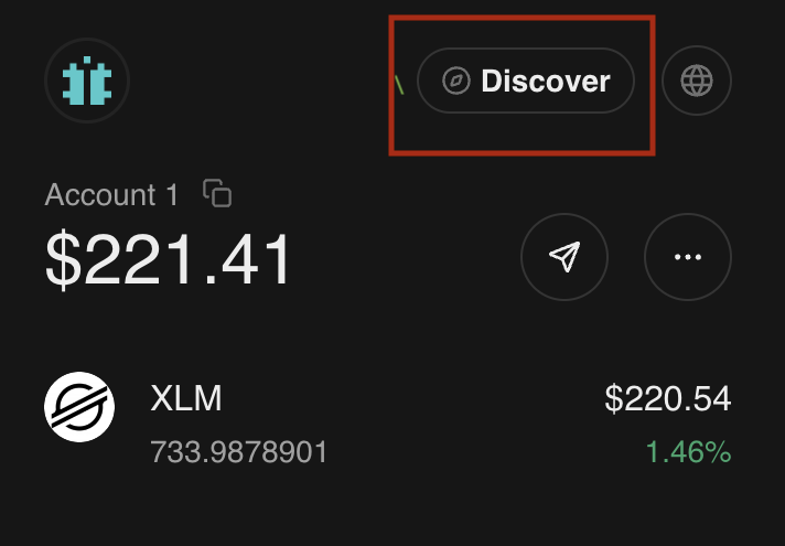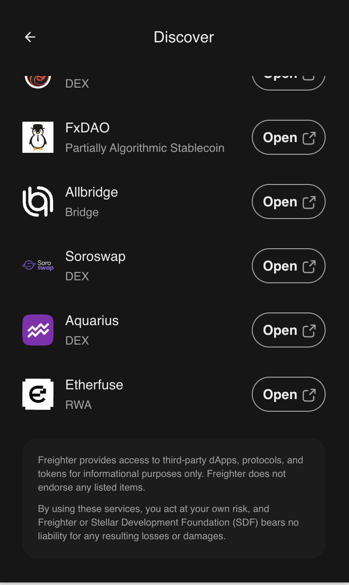 You can now find dapps to connect your Freighter wallet to from the Discover screen. Here, you'll find dapps that provide different services, like lending, DEXs, and bridging.