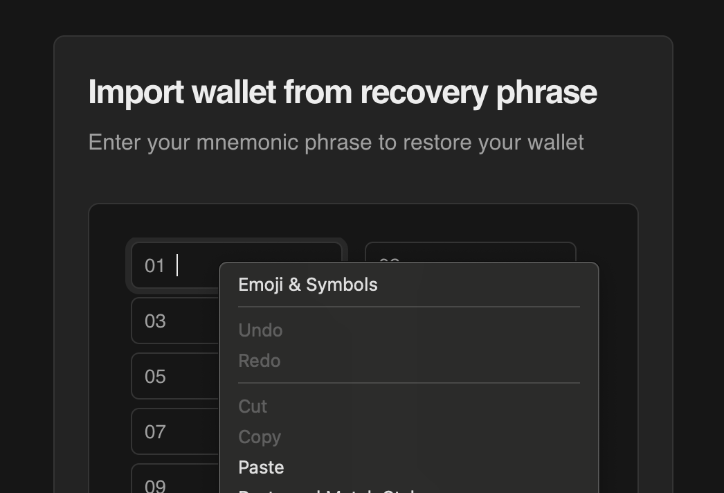 Please note that when you do so, we will automatically clear your clipboard after successful paste. This is because keeping your mnemonic phrase (or secret key) in your clipboard is a vulnerable place that hackers may have access to. Because of that, we generally encourage users to never store sensitive information in their clipboard.